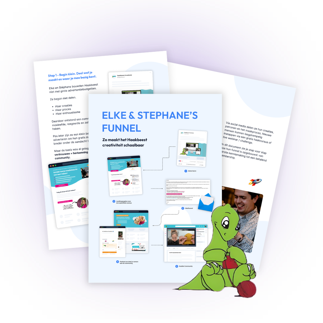 In deze PDF zie je stap voor stap hoe hun funnel werkt: van gratis cursus naar een platform met terugkerende omzet en 30.000+ betrokken leden. Ontdek hoe Haakbeest:
