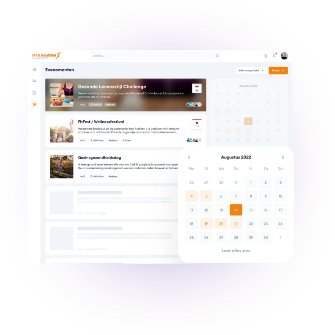 Organiseer live trainingen, workshops, masterminds of bijvoorbeeld interactieve Q&A-sessies met de handige evenementen module en agenda. Promoot je evenementen vervolgens rechtstreeks in je community.
