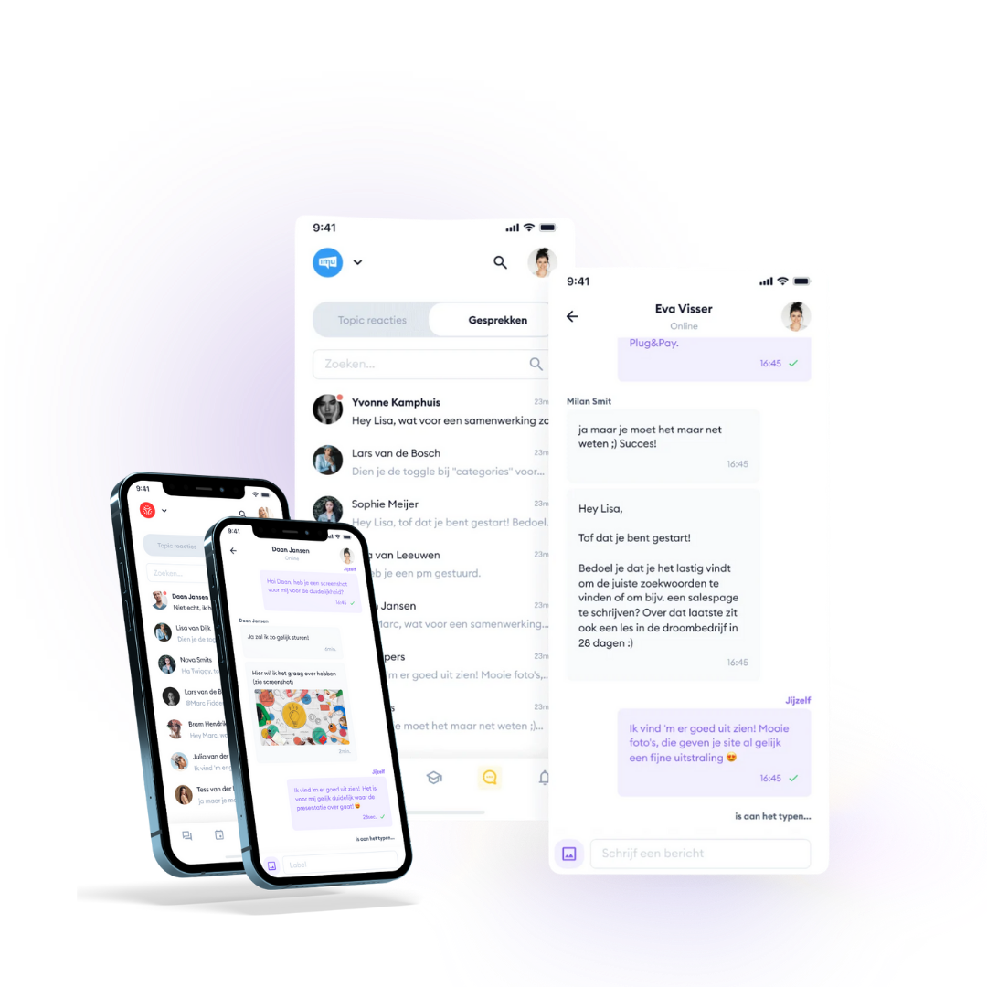 Praat direct live mee binnen alle topics en zie wie er online zijn om de betrokkenheid van jouw leden te stimuleren. Met de real-time chat breng je jouw community tot leven, net als je gewend bent van WhatsApp.